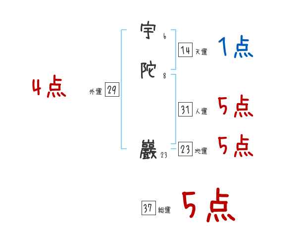 天運![]() | 宇陀巖さんの天運は14画の1つ星!人に対して優しいがストレスを溜め込みがち。人間関係のトラブルを避けるよう気をつけましょう。 家系が持つ宿命的な運勢を表します。祖先から受け継いだ苗字ですので自分の力が及びません。家柄を象徴します。 |