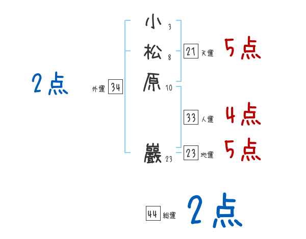 外運![]() | 小松原巖さんの外運は34画の2つ星!独創性に優れるが、自尊心が強く災難に注意しましょう。 生活面を象徴する運勢です。外部から受ける影響力を表し、結婚運、家庭運や職場、環境への順応性を表します。 |