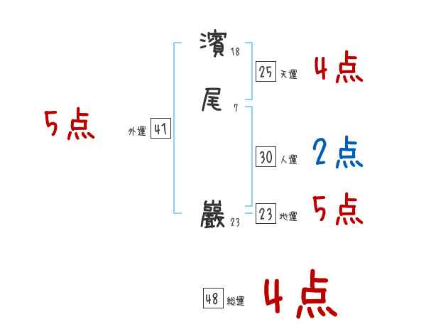 天運![]() | 濱尾巖さんの天運は25画の4つ星!個性があり才能があふれる。強運の持ち主で発展する。 家系が持つ宿命的な運勢を表します。祖先から受け継いだ苗字ですので自分の力が及びません。家柄を象徴します。 |