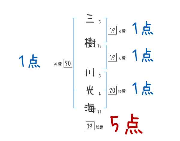 人運![]() | 三樹川光海さんの人運は19画の1つ星!優れた才能を持ちますが、協調性が足りないことも。周りの人と協力する事を意識しましょう。 性格や才能などを表す2番目に重要な運勢です。人間関係や協調性、社会的な成功に影響します。主に20歳から50歳ぐらいまでの中年期の運勢を表します。 |