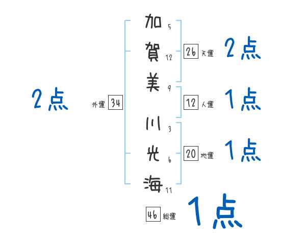 | 天運  | 加賀美川光海さんの天運は26画の2つ星!波瀾万丈かも。信頼できる人を大事にしましょう。家系が持つ宿命的な運勢を表します。祖先から受け継いだ苗字ですので自分の力が及びません。家柄を象徴します。 |