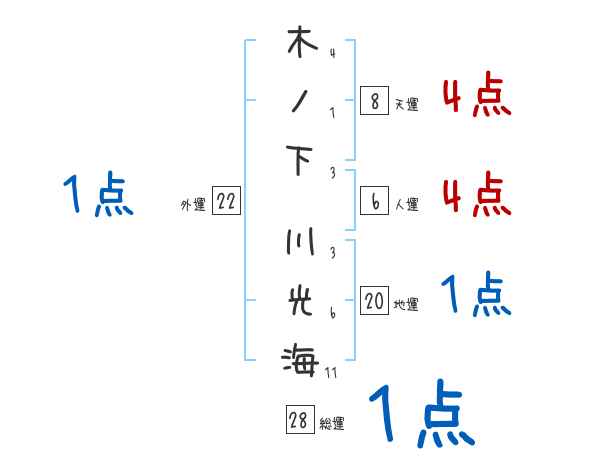 総運![]() | 木ノ下川光海さんの総運は28画の1つ星!家庭環境に注意。スポーツで活躍できる能力があるかも。 あなたの人生を表す1番重要な運勢です。生涯を通じて影響する総合運となり、主に50歳以降の晩年期に影響を及ぼします。 |