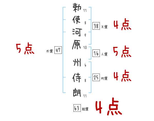 天運![]() | 勅使河原州侍朗さんの天運は38画の4つ星!温厚な性格で技術的な才能を発揮する。職人的な仕事に向いている。 家系が持つ宿命的な運勢を表します。祖先から受け継いだ苗字ですので自分の力が及びません。家柄を象徴します。 |