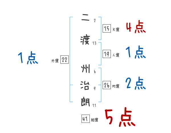天運![]() | 二渡州治朗さんの天運は15画の4つ星!人徳があり出世する。順調に物事を進め円満な人生。 家系が持つ宿命的な運勢を表します。祖先から受け継いだ苗字ですので自分の力が及びません。家柄を象徴します。 |