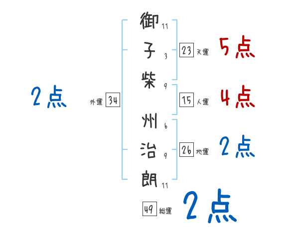 天運![]() | 御子柴州治朗さんの天運は23画の5つ星!想像力に優れ活力がある。一代で成功し名誉を手に入れる。 家系が持つ宿命的な運勢を表します。祖先から受け継いだ苗字ですので自分の力が及びません。家柄を象徴します。 |