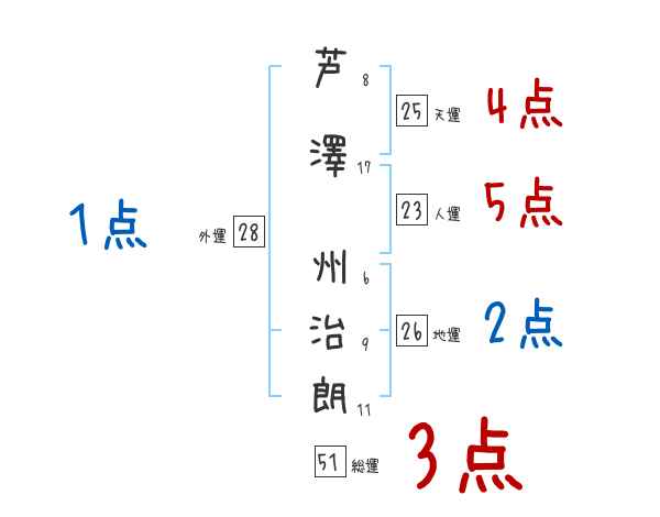 地運![]() | 芦澤州治朗さんの地運は26画の2つ星!波瀾万丈かも。信頼できる人を大事にしましょう。 個性を表す基礎的な運勢です。性格形成や対人関係、行動力など家庭環境に影響されます。主に誕生してから20歳くらいまでの若年期の運勢を表します。 |