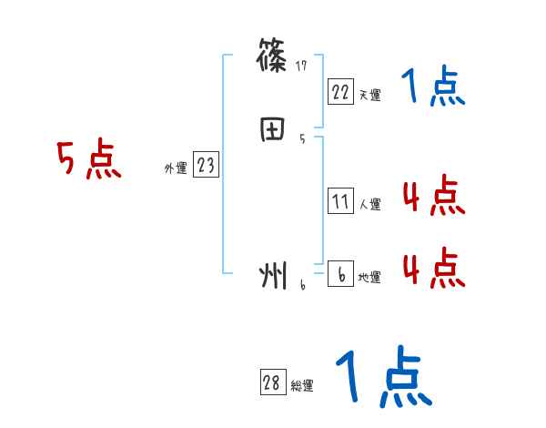 外運![]() | 篠田州さんの外運は23画の5つ星!想像力に優れ活力がある。一代で成功し名誉を手に入れる。 生活面を象徴する運勢です。外部から受ける影響力を表し、結婚運、家庭運や職場、環境への順応性を表します。 |