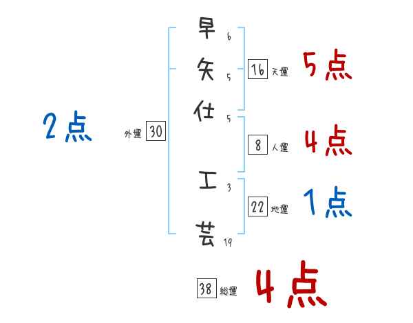 天運![]() | 早矢仕工芸さんの天運は16画の5つ星!人望が厚く大きく発展する。逆転成功が見える。 家系が持つ宿命的な運勢を表します。祖先から受け継いだ苗字ですので自分の力が及びません。家柄を象徴します。 |
