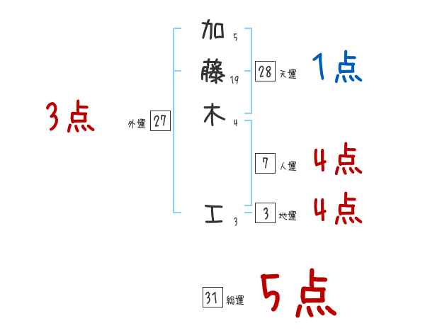 天運![]() | 加藤木工さんの天運は28画の1つ星!家庭環境に注意。スポーツで活躍できる能力があるかも。 家系が持つ宿命的な運勢を表します。祖先から受け継いだ苗字ですので自分の力が及びません。家柄を象徴します。 |