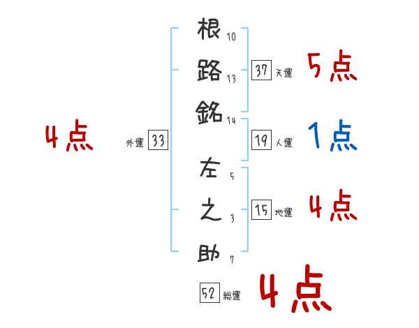 総運![]() | 根路銘左之助さんの総運は52画の4つ星!先見性と独創性に優れ考える力がある。強運の持ち主。 あなたの人生を表す1番重要な運勢です。生涯を通じて影響する総合運となり、主に50歳以降の晩年期に影響を及ぼします。 |