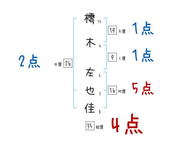 外運![]() | 樗木左也佳さんの外運は26画の2つ星!波瀾万丈かも。信頼できる人を大事にしましょう。 生活面を象徴する運勢です。外部から受ける影響力を表し、結婚運、家庭運や職場、環境への順応性を表します。 |
