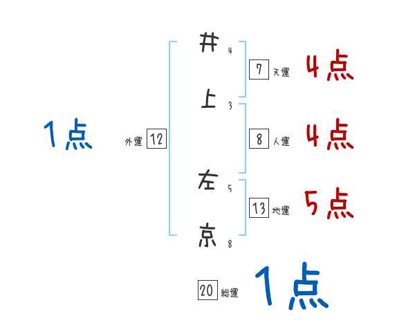 人運![]() | 井上左京さんの人運は8画の4つ星!勤勉家。根気強く努力し成功する。忍耐力がある。 性格や才能などを表す2番目に重要な運勢です。人間関係や協調性、社会的な成功に影響します。主に20歳から50歳ぐらいまでの中年期の運勢を表します。 |