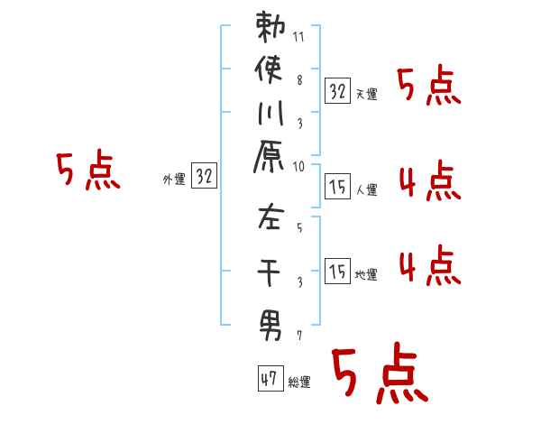 天運![]() | 勅使川原左千男さんの天運は32画の5つ星!柔軟性があり成功する。チャンスが多く金運が良い。 家系が持つ宿命的な運勢を表します。祖先から受け継いだ苗字ですので自分の力が及びません。家柄を象徴します。 |