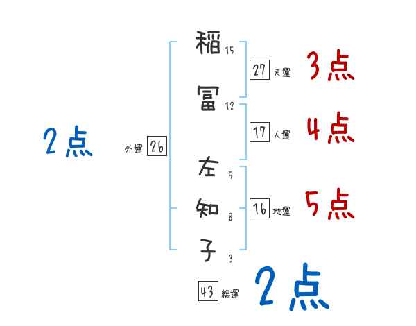 総運![]() | 稲冨左知子さんの総運は43画の2つ星!頑固な性格で独立心が強いかも。やや非現実的で浪費に注意しましょう。 あなたの人生を表す1番重要な運勢です。生涯を通じて影響する総合運となり、主に50歳以降の晩年期に影響を及ぼします。 |