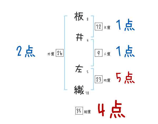 天運![]() | 板井左織さんの天運は12画の1つ星!簡単な失敗で諦めてしまいやすいかも。着実に行動すると良いでしょう。 家系が持つ宿命的な運勢を表します。祖先から受け継いだ苗字ですので自分の力が及びません。家柄を象徴します。 |