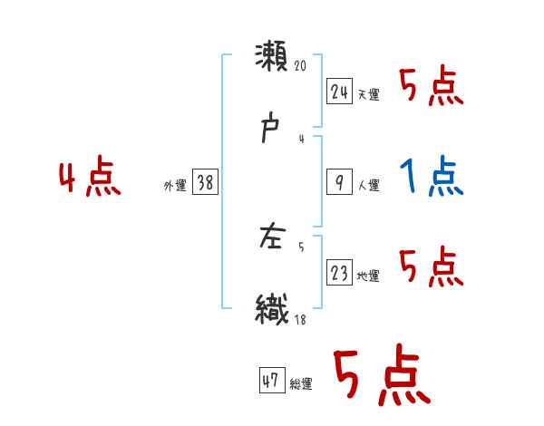 天運![]() | 瀬戸左織さんの天運は24画の5つ星!家庭運が良く順調な人生。金運にも恵まれる。 家系が持つ宿命的な運勢を表します。祖先から受け継いだ苗字ですので自分の力が及びません。家柄を象徴します。 |