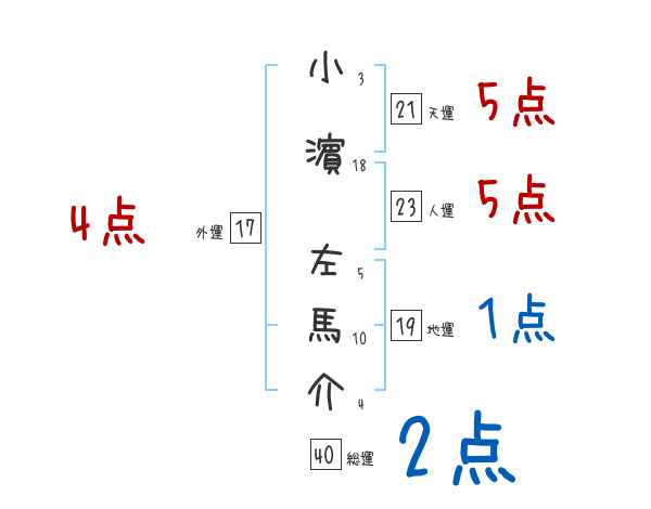 外運![]() | 小濵左馬介さんの外運は17画の4つ星!積極的な行動力。地位を気づき財産を手に入れる。純粋な心と直感力。 生活面を象徴する運勢です。外部から受ける影響力を表し、結婚運、家庭運や職場、環境への順応性を表します。 |