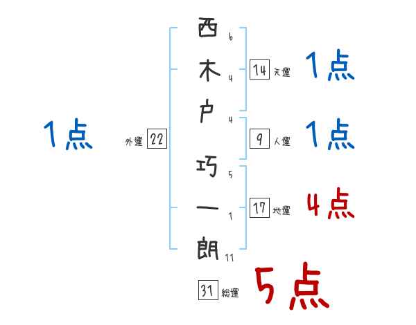 総運![]() | 西木戸巧一朗さんの総運は31画の5つ星!社交性があり判断力に優れる。順風満帆な人生で円満な生活。 あなたの人生を表す1番重要な運勢です。生涯を通じて影響する総合運となり、主に50歳以降の晩年期に影響を及ぼします。 |