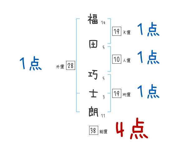 天運![]() | 福田巧士朗さんの天運は19画の1つ星!優れた才能を持ちますが、協調性が足りないことも。周りの人と協力する事を意識しましょう。 家系が持つ宿命的な運勢を表します。祖先から受け継いだ苗字ですので自分の力が及びません。家柄を象徴します。 |