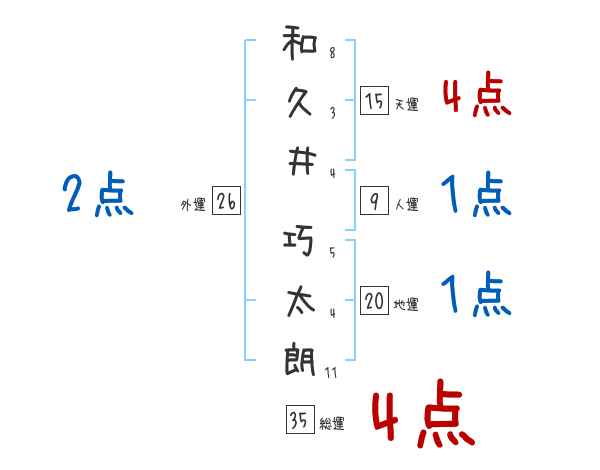 総運![]() | 和久井巧太朗さんの総運は35画の4つ星!温厚な性格で感受性が高い。穏和な性格で人望が厚い。 あなたの人生を表す1番重要な運勢です。生涯を通じて影響する総合運となり、主に50歳以降の晩年期に影響を及ぼします。 |
