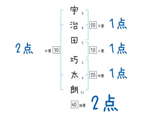 総運![]() | 宇治田巧太朗さんの総運は40画の2つ星!自信過剰で物事に固執するためトラブルに注意。 あなたの人生を表す1番重要な運勢です。生涯を通じて影響する総合運となり、主に50歳以降の晩年期に影響を及ぼします。 |