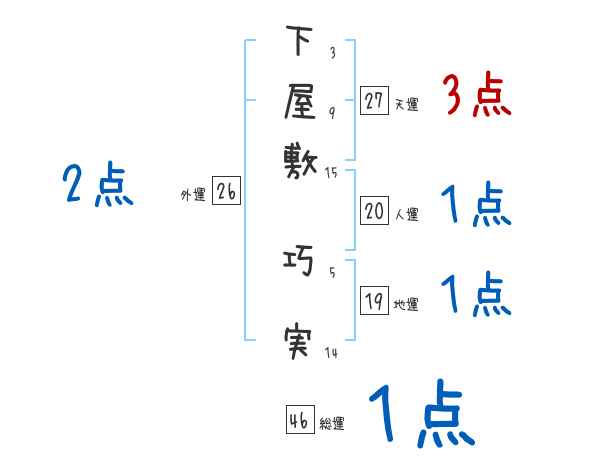 外運![]() | 下屋敷巧実さんの外運は26画の2つ星!波瀾万丈かも。信頼できる人を大事にしましょう。 生活面を象徴する運勢です。外部から受ける影響力を表し、結婚運、家庭運や職場、環境への順応性を表します。 |