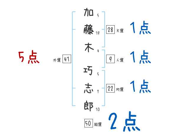 天運![]() | 加藤木巧志郎さんの天運は28画の1つ星!家庭環境に注意。スポーツで活躍できる能力があるかも。 家系が持つ宿命的な運勢を表します。祖先から受け継いだ苗字ですので自分の力が及びません。家柄を象徴します。 |