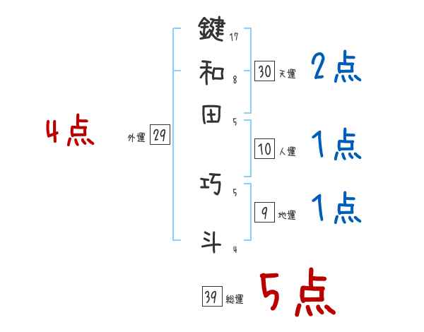 天運![]() | 鍵和田巧斗さんの天運は30画の2つ星!浮き沈みの激しさに注意しましょう。 家系が持つ宿命的な運勢を表します。祖先から受け継いだ苗字ですので自分の力が及びません。家柄を象徴します。 |