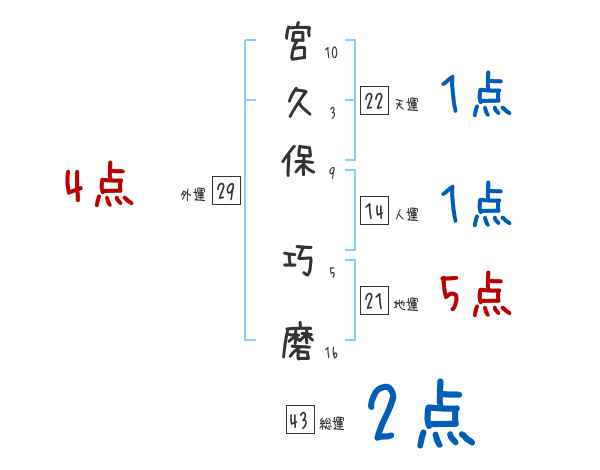 総運![]() | 宮久保巧磨さんの総運は43画の2つ星!頑固な性格で独立心が強いかも。やや非現実的で浪費に注意しましょう。 あなたの人生を表す1番重要な運勢です。生涯を通じて影響する総合運となり、主に50歳以降の晩年期に影響を及ぼします。 |