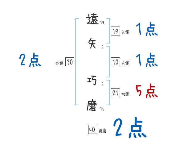 天運![]() | 遠矢巧磨さんの天運は19画の1つ星!優れた才能を持ちますが、協調性が足りないことも。周りの人と協力する事を意識しましょう。 家系が持つ宿命的な運勢を表します。祖先から受け継いだ苗字ですので自分の力が及びません。家柄を象徴します。 |