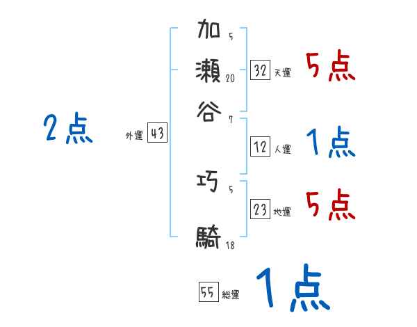 天運![]() | 加瀬谷巧騎さんの天運は32画の5つ星!柔軟性があり成功する。チャンスが多く金運が良い。 家系が持つ宿命的な運勢を表します。祖先から受け継いだ苗字ですので自分の力が及びません。家柄を象徴します。 |