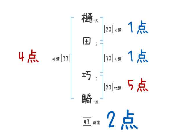 外運![]() | 樋田巧騎さんの外運は33画の4つ星!権力志向でプライドが高い。勇気があり運を切り開き成功する。 生活面を象徴する運勢です。外部から受ける影響力を表し、結婚運、家庭運や職場、環境への順応性を表します。 |