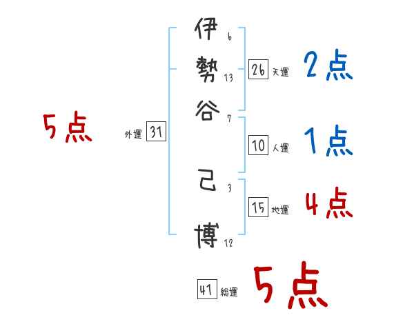 天運![]() | 伊勢谷己博さんの天運は26画の2つ星!波瀾万丈かも。信頼できる人を大事にしましょう。 家系が持つ宿命的な運勢を表します。祖先から受け継いだ苗字ですので自分の力が及びません。家柄を象徴します。 |