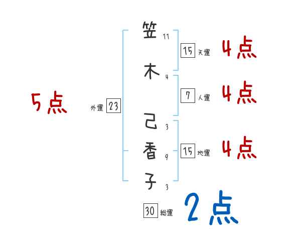 外運![]() | 笠木己香子さんの外運は23画の5つ星!想像力に優れ活力がある。一代で成功し名誉を手に入れる。 生活面を象徴する運勢です。外部から受ける影響力を表し、結婚運、家庭運や職場、環境への順応性を表します。 |