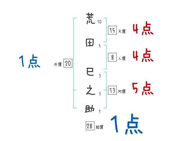 総運![]() | 荒田巳之助さんの総運は28画の1つ星!家庭環境に注意。スポーツで活躍できる能力があるかも。 あなたの人生を表す1番重要な運勢です。生涯を通じて影響する総合運となり、主に50歳以降の晩年期に影響を及ぼします。 |