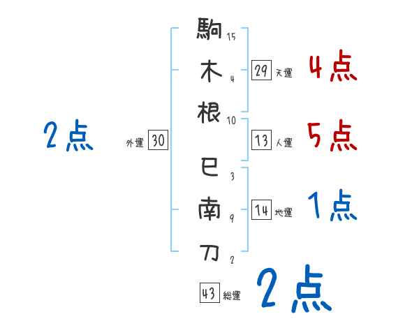 総運![]() | 駒木根巳南刀さんの総運は43画の2つ星!頑固な性格で独立心が強いかも。やや非現実的で浪費に注意しましょう。 あなたの人生を表す1番重要な運勢です。生涯を通じて影響する総合運となり、主に50歳以降の晩年期に影響を及ぼします。 |