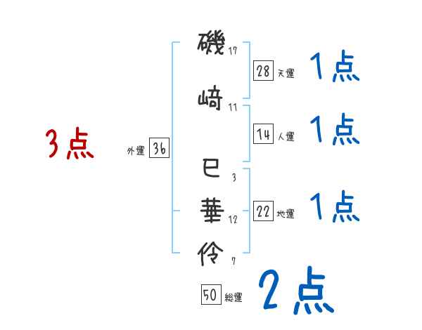 天運![]() | 磯﨑巳華伶さんの天運は28画の1つ星!家庭環境に注意。スポーツで活躍できる能力があるかも。 家系が持つ宿命的な運勢を表します。祖先から受け継いだ苗字ですので自分の力が及びません。家柄を象徴します。 |