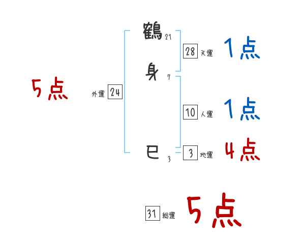 天運![]() | 鶴身巳さんの天運は28画の1つ星!家庭環境に注意。スポーツで活躍できる能力があるかも。 家系が持つ宿命的な運勢を表します。祖先から受け継いだ苗字ですので自分の力が及びません。家柄を象徴します。 |