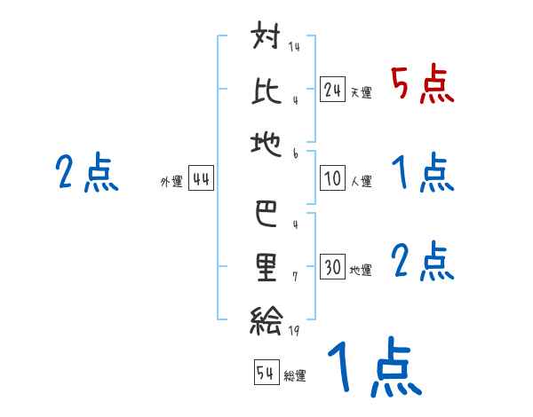 総運![]() | 対比地巴里絵さんの総運は54画の1つ星!トラブルが多いかも。周りをよく見て協調して過ごしましょう。 あなたの人生を表す1番重要な運勢です。生涯を通じて影響する総合運となり、主に50歳以降の晩年期に影響を及ぼします。 |
