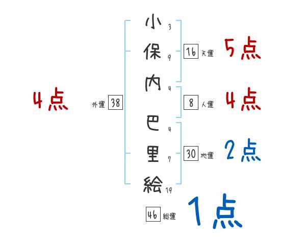 天運![]() | 小保内巴里絵さんの天運は16画の5つ星!人望が厚く大きく発展する。逆転成功が見える。 家系が持つ宿命的な運勢を表します。祖先から受け継いだ苗字ですので自分の力が及びません。家柄を象徴します。 |