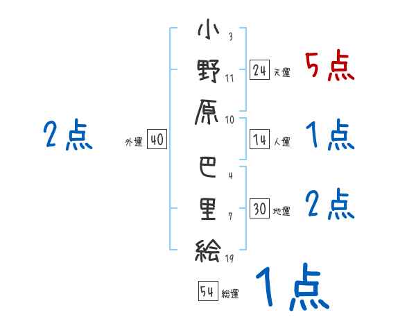 天運![]() | 小野原巴里絵さんの天運は24画の5つ星!家庭運が良く順調な人生。金運にも恵まれる。 家系が持つ宿命的な運勢を表します。祖先から受け継いだ苗字ですので自分の力が及びません。家柄を象徴します。 |