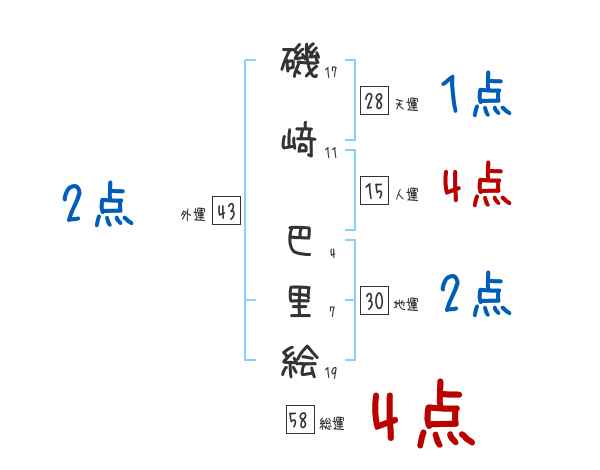外運![]() | 磯﨑巴里絵さんの外運は43画の2つ星!頑固な性格で独立心が強いかも。やや非現実的で浪費に注意しましょう。 生活面を象徴する運勢です。外部から受ける影響力を表し、結婚運、家庭運や職場、環境への順応性を表します。 |