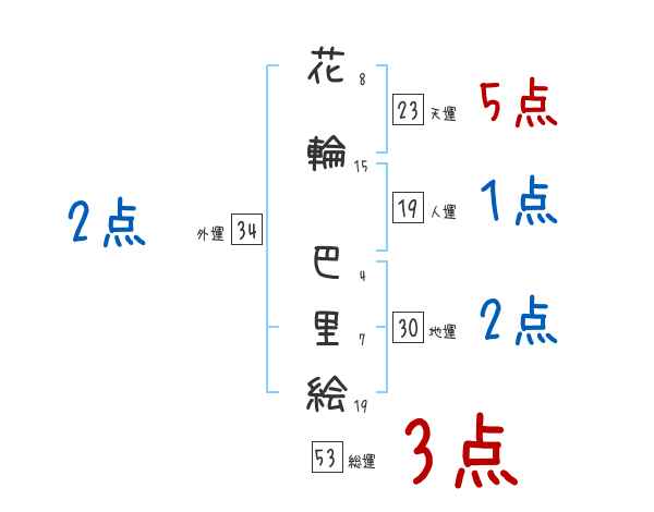 天運![]() | 花輪巴里絵さんの天運は23画の5つ星!想像力に優れ活力がある。一代で成功し名誉を手に入れる。 家系が持つ宿命的な運勢を表します。祖先から受け継いだ苗字ですので自分の力が及びません。家柄を象徴します。 |