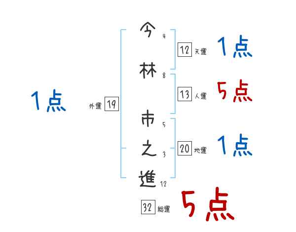 総運![]() | 今林市之進さんの総運は32画の5つ星!柔軟性があり成功する。チャンスが多く金運が良い。 あなたの人生を表す1番重要な運勢です。生涯を通じて影響する総合運となり、主に50歳以降の晩年期に影響を及ぼします。 |