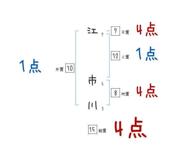 天運![]() | 江市川さんの天運は7画の4つ星!強い意志や信念を持ち独立心が強い。自立する。 家系が持つ宿命的な運勢を表します。祖先から受け継いだ苗字ですので自分の力が及びません。家柄を象徴します。 |
