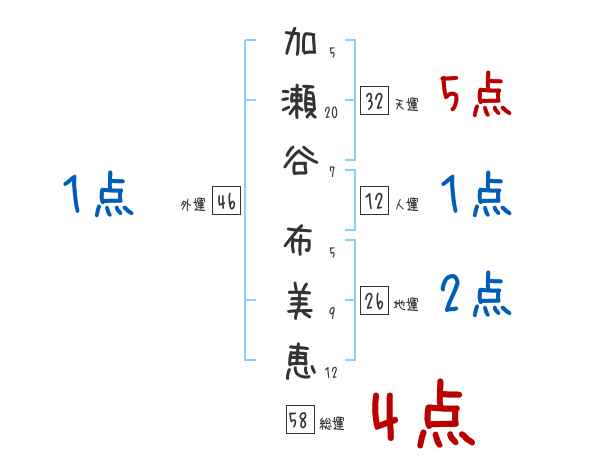 天運![]() | 加瀬谷布美恵さんの天運は32画の5つ星!柔軟性があり成功する。チャンスが多く金運が良い。 家系が持つ宿命的な運勢を表します。祖先から受け継いだ苗字ですので自分の力が及びません。家柄を象徴します。 |