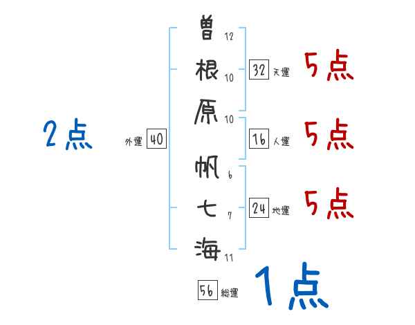 天運![]() | 曽根原帆七海さんの天運は32画の5つ星!柔軟性があり成功する。チャンスが多く金運が良い。 家系が持つ宿命的な運勢を表します。祖先から受け継いだ苗字ですので自分の力が及びません。家柄を象徴します。 |