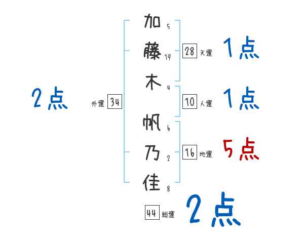 天運![]() | 加藤木帆乃佳さんの天運は28画の1つ星!家庭環境に注意。スポーツで活躍できる能力があるかも。 家系が持つ宿命的な運勢を表します。祖先から受け継いだ苗字ですので自分の力が及びません。家柄を象徴します。 |