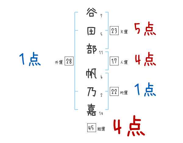 谷田部帆乃嘉さんの総運は45画の4つ星