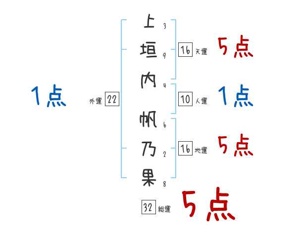 天運![]() | 上垣内帆乃果さんの天運は16画の5つ星!人望が厚く大きく発展する。逆転成功が見える。 家系が持つ宿命的な運勢を表します。祖先から受け継いだ苗字ですので自分の力が及びません。家柄を象徴します。 |